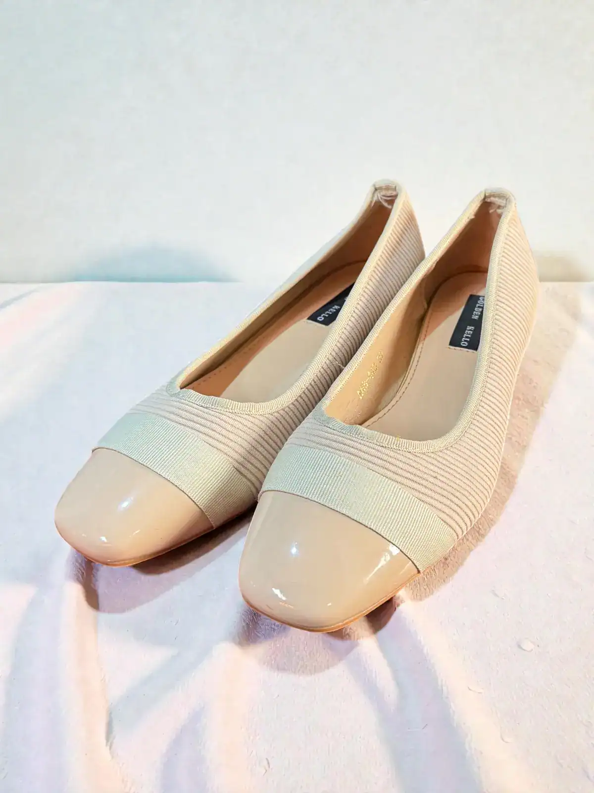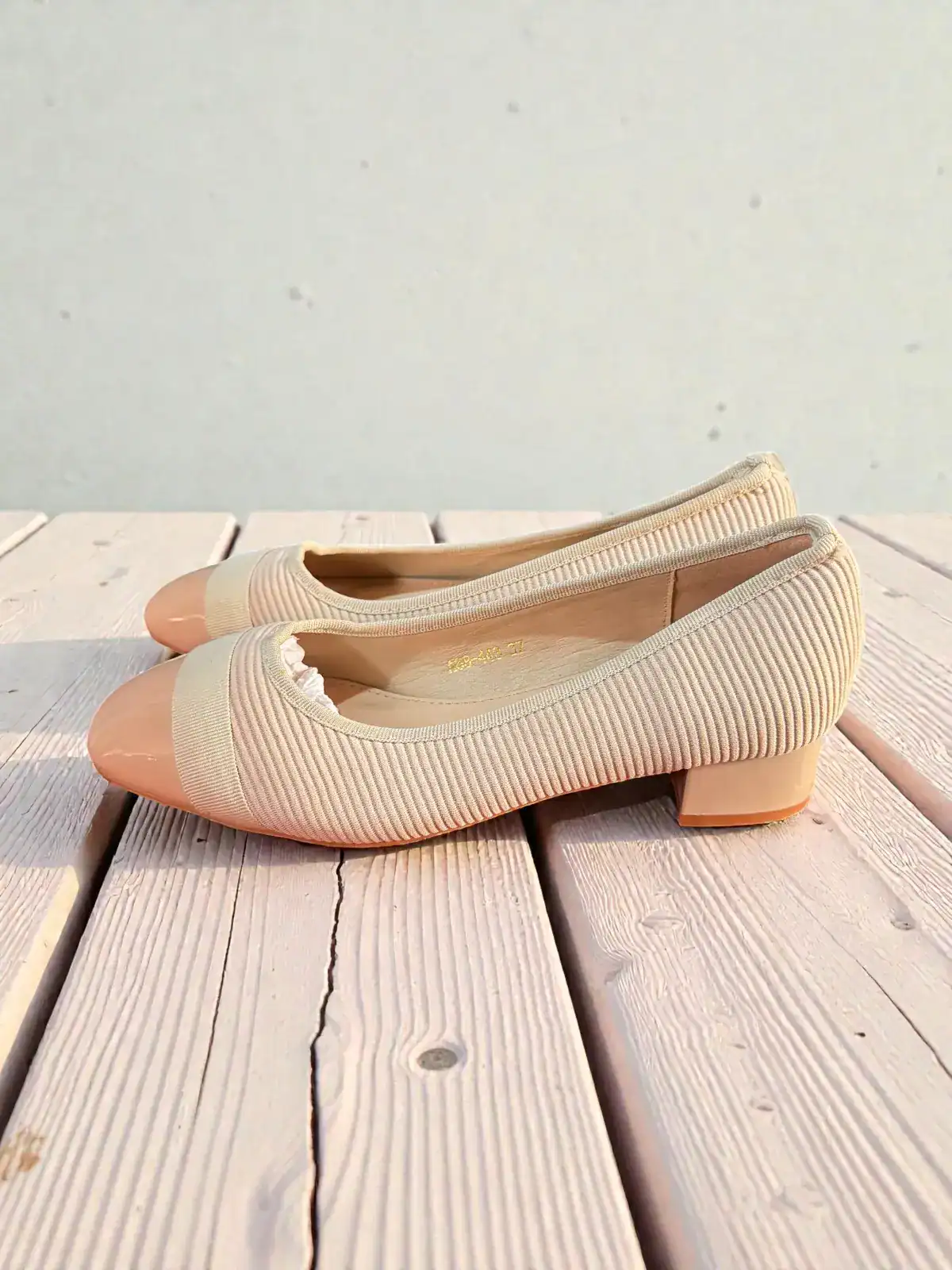 Ballerines beiges confortables avec bout vernis et tissu côtelé élastique, parfaites pour un style doux et élégant au quotidien.