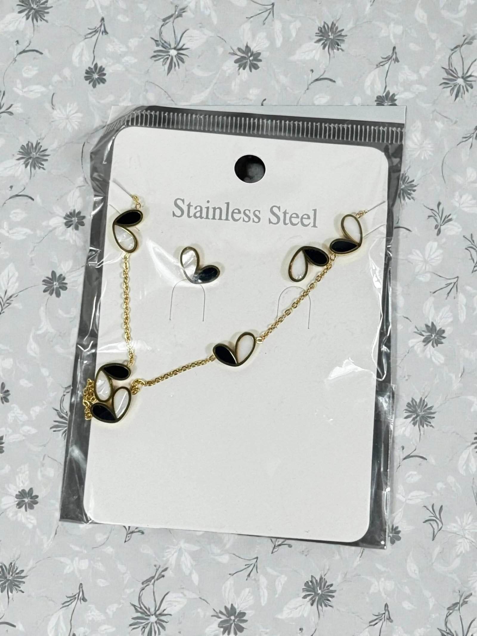 Cet ensemble élégant en acier inoxydable associe harmonieusement le noir et le blanc nacré dans un design en forme de cœur raffiné. Discret mais sophistiqué, il ajoute instantanément une touche de classe à votre look.