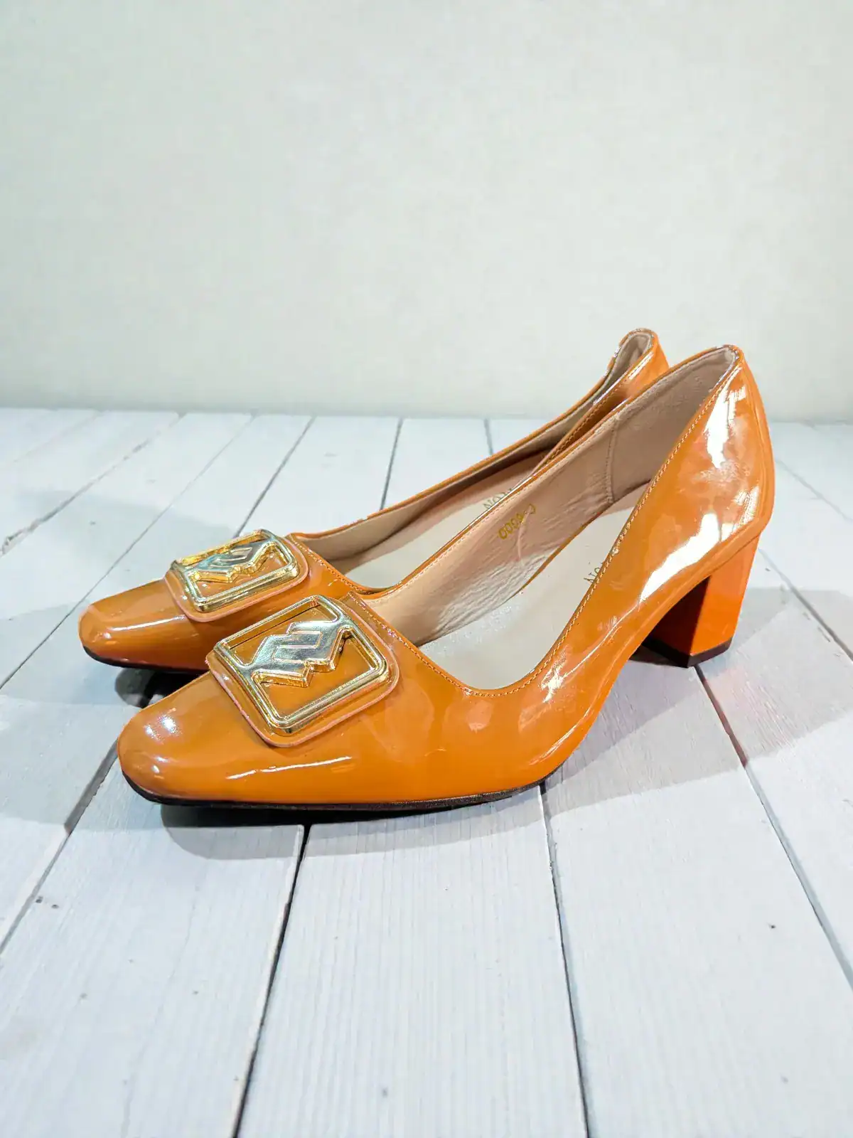 Soyez le premier à laisser votre avis sur “Escarpins orange vernis avec boucle dorée”