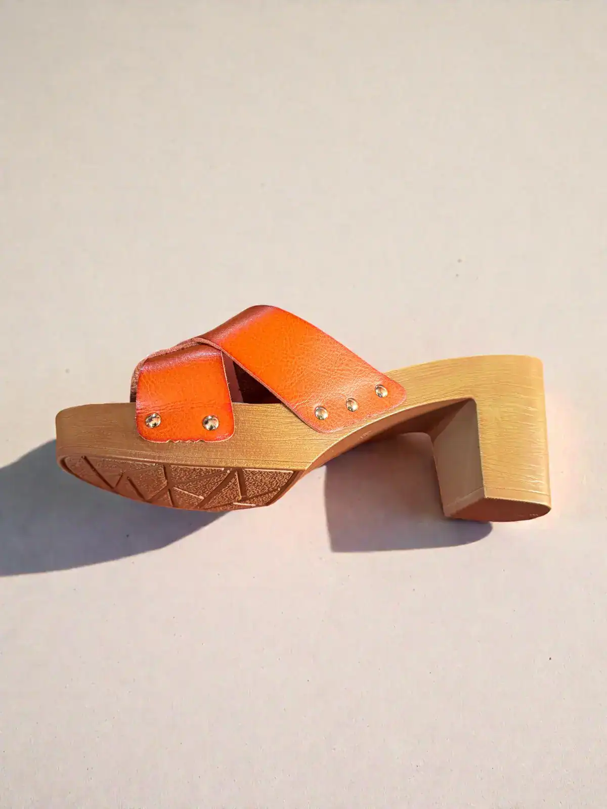Sandales à talons en bois au design rétro chic, en cuir orange éclatant. Confortables et stylées, parfaites pour l’été.