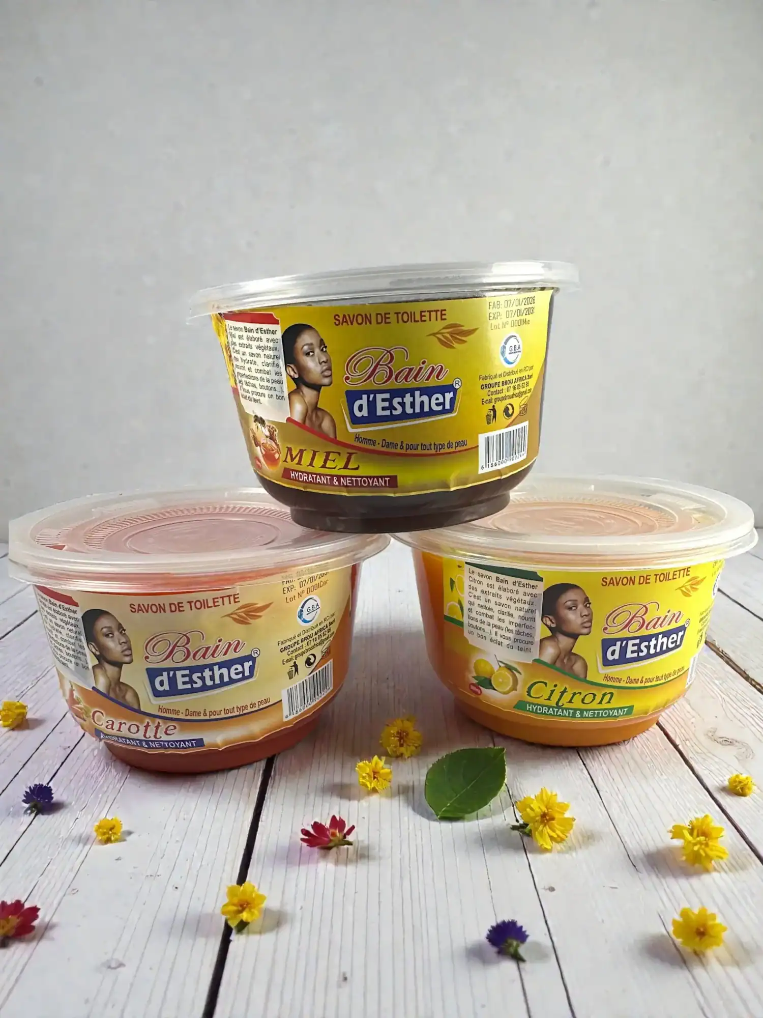Le savon Bain d’Esther est conçu pour offrir à votre peau un soin complet au quotidien. Sa formule enrichie en extraits naturels associe les bienfaits du miel, reconnu pour ses propriétés hydratantes et nourrissantes, du citron, apprécié pour son action purifiante et éclaircissante, et de la carotte, connue pour aider à revitaliser et unifier le teint.